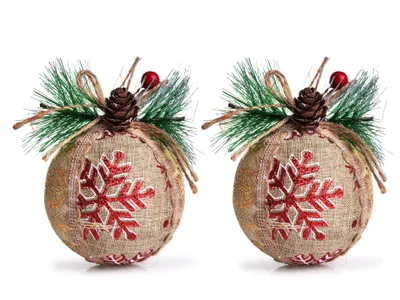 RUSZTIKUS GOLYÓ HÓPELYHET | karácsonyi díszek szövetborítással és díszítéssel | 2 db × 7,5 cm