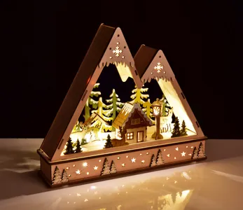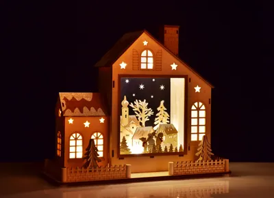 LED karácsonyi dekoráció | fából készült ház téli falucskával | megvilágított csendélet | szélesség 35 cm