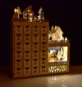 Adventi LED naptár | nagy fából készült falucskával | 24 fiók ajándékoknak | magasság 43 cm