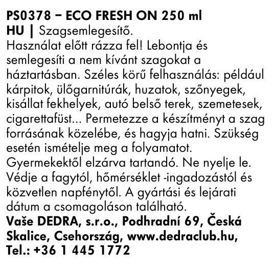 Az öko szagsemlegesítő FRESH-ON hatékony, ugyanakkor teljesen parfümmentes termék a háztartásban és az autóban. A természetes enzimek hatékony kombinációja aktívan bontja a biológiai eredetű szagmolekulákat – izzadságot, vizeletet, penészszagokat, háziállatok szagát, cigarettafüstöt és dohos szagokat.