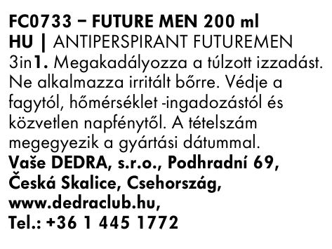 A FUTURE MEN PLATINUM 3in1 férfi izzadásgátló, amely természetes kövületen alapul, alumínium sók nélkül. Véd a verejtékezés és a szagok ellen, antibakteriális hatású és nem hagy fehér foltokat. Alkalmas hónaljra, lábakra és férfi zónákra is.