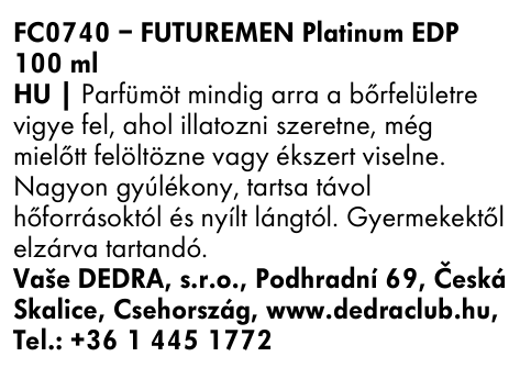 FUTURE MEN® PLATINUM – friss férfi fás parfüm víz mandarinnal, narancssal, lime-mal, cédrussal és pacsulival. Luxus illat férfiaknak, akiknek karaktere és eleganciája van, tartós a magas illóolaj-tartalmának köszönhetően.