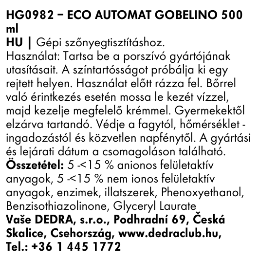 EKO sampon GOBELINO AUTOMAT habzásmentes formulával a szőnyegek és kárpitok gépi tisztításához. Eltávolítja a szennyeződéseket, semlegesíti a szagokat és élénkíti a színeket. Ideális tisztítógépekhez. Űrtartalom 500 ml.