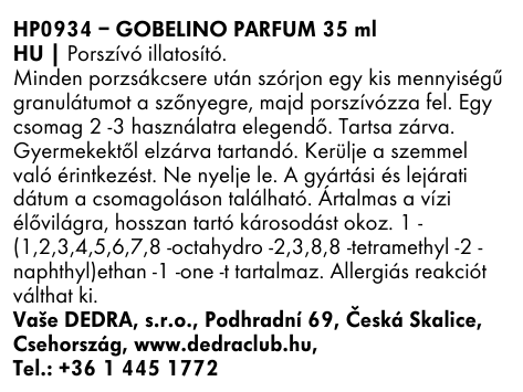 A GOBELINO parfümgranulák illatosítják a belső teret a porszívózás során, és semlegesítik a szagokat. A luxus kozmetikai illat a porszívón keresztül szabadul fel a fűtött áramló levegő által. Elegendő 3 porszívószükséglethez.