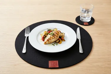 Elegáns 12 db kerek filc terítő készlet két méretben (38 cm és 10 cm). Megvédi az asztalt a karcolásoktól és foltoktól, és stílust ad – alkalmas mindennapi étkezéshez, mind pedig ünnepi alkalmakra.