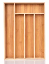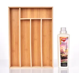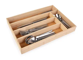 Bambusz evőeszköztartó fiókba 5 rekesszel, 28 × 38,5 cm-es méretben. Átlátható elhelyezést biztosít az evőeszközök számára, és elegáns rendet teremt a konyhai fiókban.