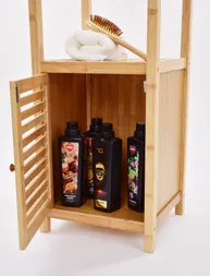 🌿 A természet szépsége a rend szolgálatában. A bambusz polc GoEco® ideális választás, ha a praktikusságot és az elegáns megjelenést szeretnéd ötvözni. Két nyitott polcnak köszönhetően olyan dolgokat tárolhatsz, amelyeket azonnal kézhez akarsz venni, és a alsó szekrény ajtókkal diszkrét tárolóhelyet nyújt a törölközők, kozmetikumok vagy apróságok számára. Akár a fürdőszobába, hálószobába vagy előszobába állítod, tisztaság, harmónia és természetes elegancia érzetét hozza a térbe.