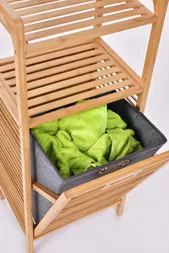 BAMBUS POLC kihajtható ruhás kosárral, melírozott anyagból készült, két bambusz polccal a tetején.
