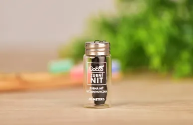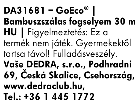 30 m bambuszrost fogselyem aktív bambusz szenet tartalmazó, enyhe mentol ízzel, üvegből készült flakonban fém fedővel és egy kis vágóéllel a szükséges szál levágásához. Flakon mérete: magassága 15 cm.