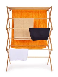 Többszintes GoEco® bambusz szárító (105 cm) helyet takarít meg és lehetővé teszi a ruhák egymás felett történő szárítását. Az erős rudak kíméletesek a textíliához – minimalizálják a gyűrődést szárítás közben. Stílusos, összecsukható és ellenálló a nagy nyomású bambusznak köszönhetően. Méretek: 74×36×105 cm.