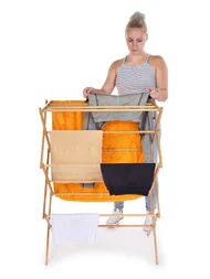 Elegáns és praktikus segítő minden háztartásban! GoEco® bambusz összecsukható szárító ruhát szárít több szinten egymás felett, így ideális kisebb lakásokba vagy fürdőszobákba. Az erős rudak kíméletesek a textíliához – az anyag kevésbé gyűrődik, és a szárítás egyenletesebb, mint a klasszikus drót szárítók esetében. Miután megszáradt, egyszerűen lapra hajtható, és eltehető például a szekrény mögé.