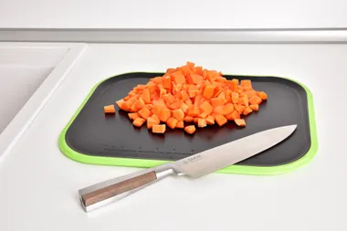 - Stabilitás és szilárd fogás: A vágódeszka széleit gumi veszi körül, biztosítva ezzel a stabilitást és a szilárd fogást vágás közben. Ennek köszönhetően pontosan és biztonságosan vághatod fel az alapanyagokat.