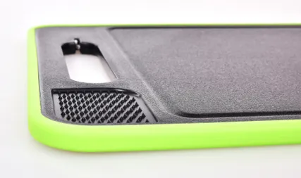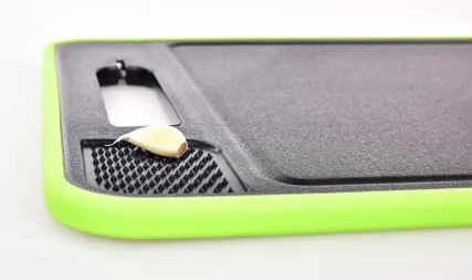 4 az 1-ben vágódeszka fagyasztási felülettel, késhéjjatóval a fogantyúban és mini reszelővel. A tartós műanyag, hőre lágyuló gumi és fémből készült tapadásmentes felület kombinációja.