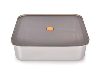A nagy rozsdamentes acél GOURMET 3,7 L edény átlátszó fedéllel, szilikon tömítéssel és szeleppel védi az ételeket a kiömléstől, levegőtől és nedvességtől. Légtömör és elegáns – ideális ebédekhez, salátákhoz, pékárukhoz és élelmiszerek tárolásához otthon vagy útközben.