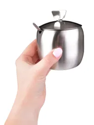 Elegáns rozsdamentes acél cukrozó 300 ml-es, kanállal és fedővel a cukor stílusos tálalásához a konyhában és az étkezőasztalon. Modern és klasszikus otthonokba is alkalmas.