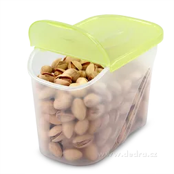 A praktikus GREENBOX tároló 750 ml űrtartalommal rendelkezik, és levehető fedéllel van ellátva, amely lehetővé teszi a liszt, cukor, hüvelyesek vagy tészta kényelmes adagolását. Mikrohullámú sütőben, fagyasztóban és mosogatógépben is használható. Ideális a száraz élelmiszerek mindennapi tárolására a konyhában.