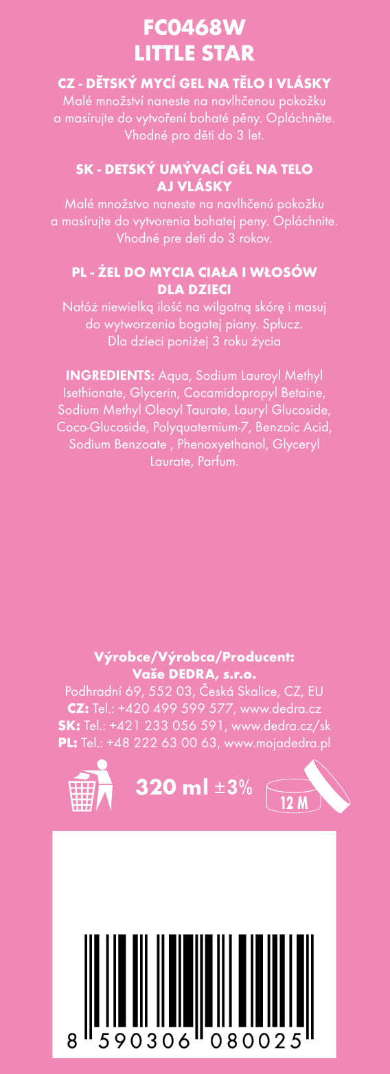Ultra kímélő gyermek tusfürdő LITTLE STAR testre és hajra (320 ml). Kifejezetten a gyermekek és csecsemők érzékeny bőrére készült. Finoman, de hatékonyan tisztít, hipoallergén, bőrgyógyászatilag tesztelt, SLS, parabén, színezék és alkohol nélkül.