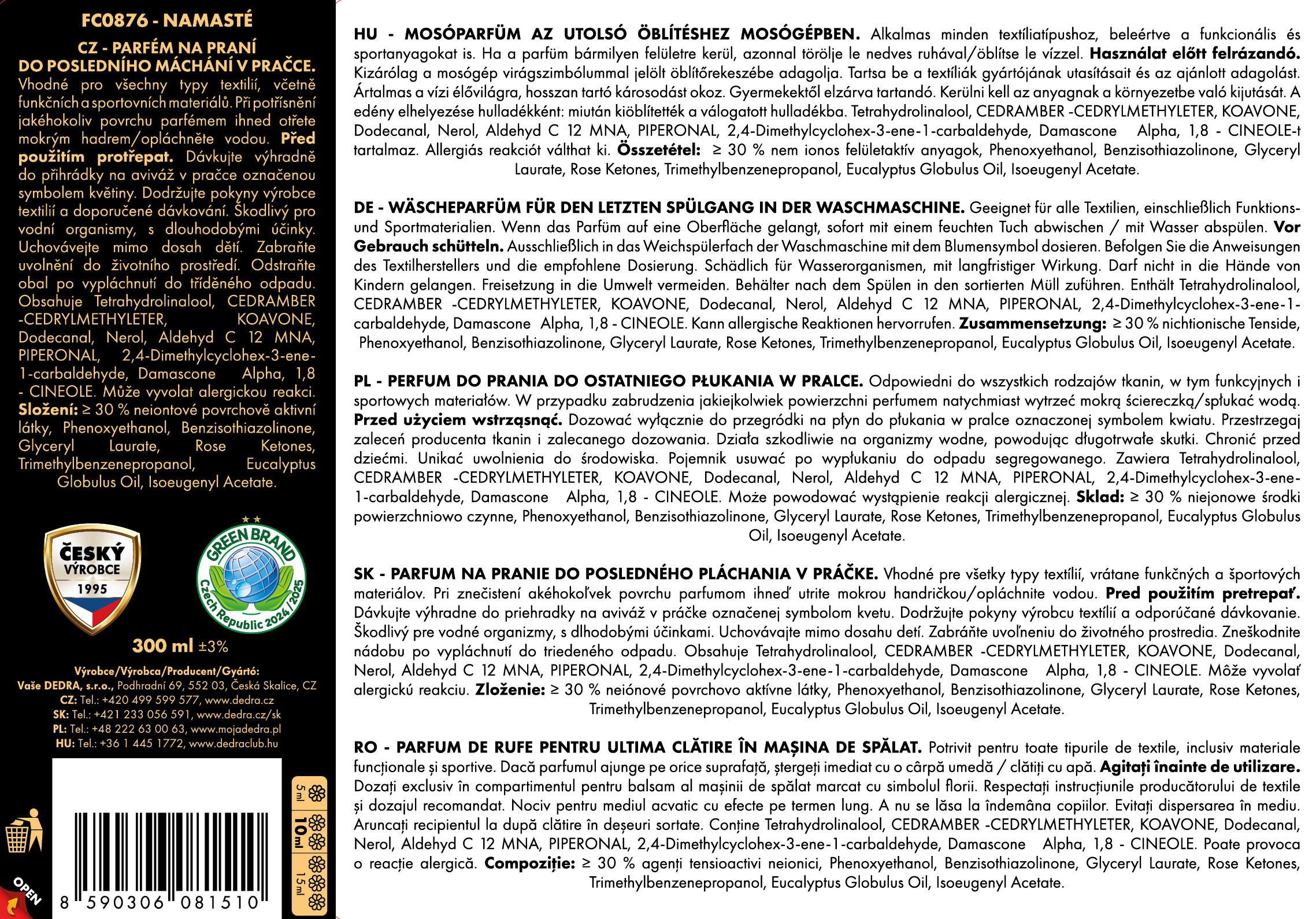 PARFUMAGE® SUPREME NAMASTÉ – 4× kisebb adag, 4× nagyobb hatás. Elég csak 5–15 ml mosáshoz, és ruhája intenzív, tartós illatot kap. Fellendíti a színeket, semlegesíti a mosószer maradványokat, és kíméletes a bőrhöz és a mosógéphez is. Kisebb adag – nagyobb hatás, 95 °C-ig megfelelő.