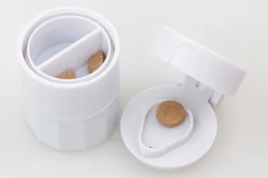 1) a felső részén található egy tabletta adagoló 2) a középső részében egy kétkamrás tabletta tároló van 3) a tároló alatt található egy ivó pohár a tabletták lenyeléséhez 4) az alján helyezkedik el a tabletta zúzó (egy tabletta elfordításával összetörheti)