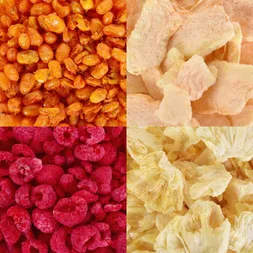 Elérhetőség az egyes lyofilizált gyümölcsfajták függ a betakarítástól és a szezonalitástól. Ezért előfordulhat, hogy egyes változatok nem mindig érhetők el.