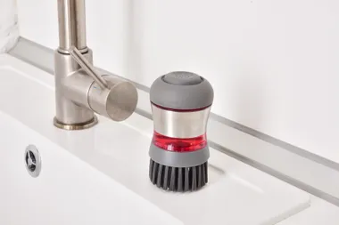 Masszív rozsdamentes acél HABARCSKÉSZÍTŐ (⌀5,5 cm × 10 cm) integrált adagolóval (50 ml) lehetővé teszi, hogy egyetlen nyomással a tisztítószert közvetlenül a sörtébe adagold. Ideális a leégett edények, serpenyők és tepsik súrolásához. Kényelmesen illeszkedik a kézbe.