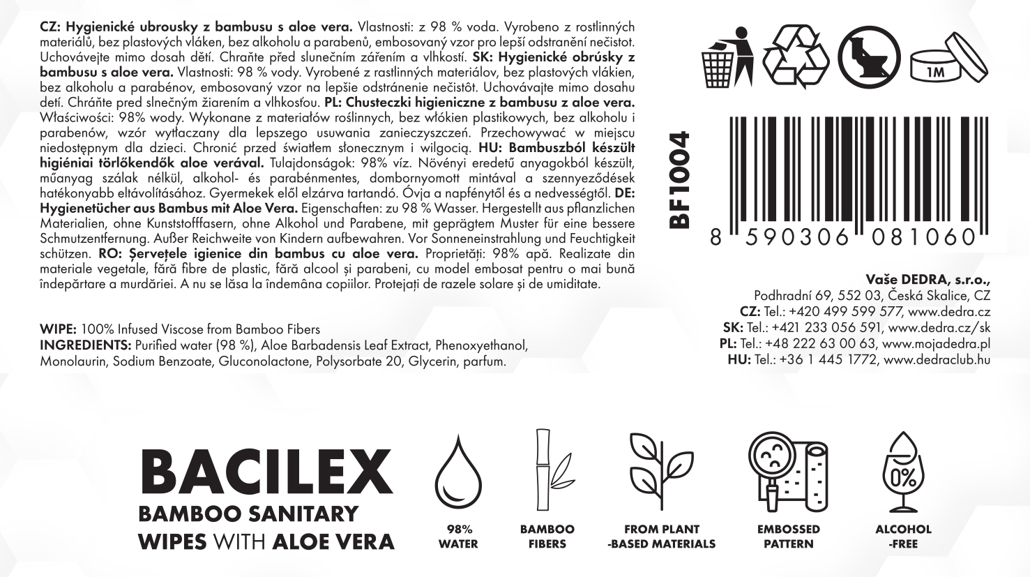 A BACILEX® bambusz hygénikus nedves törlőkendők Aloe Vera-val praktikus megoldást jelentenek a mindennapi higiéniához, valamint a bőr gyors felfrissítésére bármilyen helyzetben. Finom formulájuk hatékonyan távolítja el a szennyeződéseket és a felesleges bőrzsírt, miközben a bőrt kellemesen hidratálják és megnyugtatják.