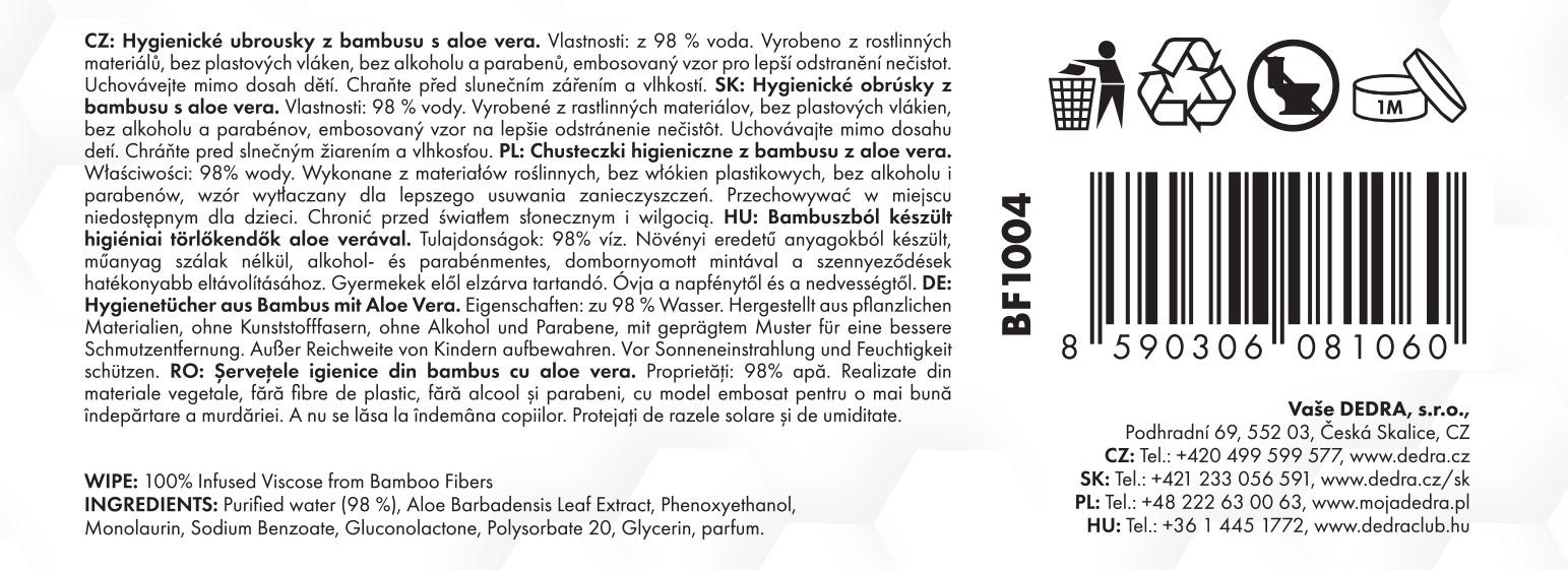 A törlőkendők bambusz anyagból készülnek, műanyag szálak nélkül és 100%-ban biológiailag lebomlóak, így kíméletesebbek a környezethez. Az Aloe Vera tartalmukkal segítik a bőr ápolását, elősegítik a regenerálódását és frissesség érzetét biztosítanak.