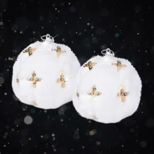 FEHÉR PLYS GOLYÓK ARANY FILC KÜLDETÉSSEL | puha karácsonyi díszek | 2 db × 7,6 cm