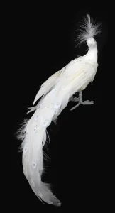 Fehér páva szétnyitott farokkal | bolyhos dísz valódi tollakkal | 30 cm