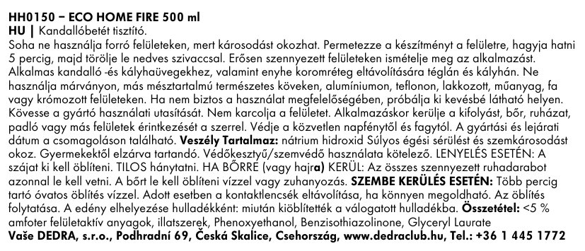 ECOHOME-FIRE 500 ml extra erős tisztítószer a kandalló és kályhák üveg részeihez, amely gyorsan és hatékonyan távolítja el a koromot, füstöt és maradványokat. Ideális kandallóbetétekhez, kályhákhoz és magasan szennyezett üveges ajtókhoz.