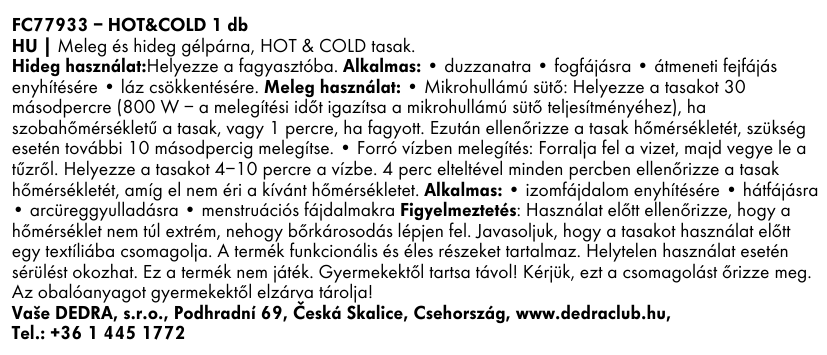 - Használat: hideg borogatás (mélyhűtő), meleg borogatás (mikrohullámú sütő vagy forró víz)
