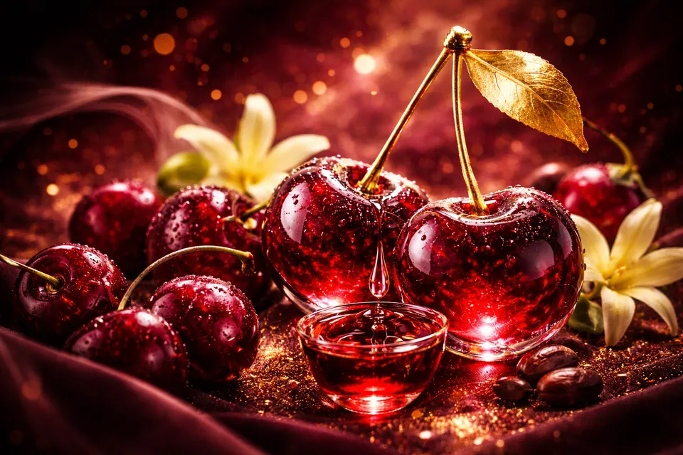 Fej: cseresznye- és cseresznyelikőr, ylang-ylang, keserű mandulák