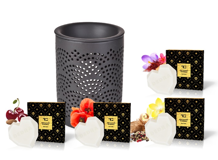 A készlet tartalmazza: 1 x 40 ml szójás illatos eko-viasz az aromalámpához POPPY MEADOW + 1 x 40 ml szójás illatos eko-viasz az aromalámpához ORIENTAL SPA + 1 x 40 ml szójás illatos eko-viasz az aromalámpához RED VELVET + 1 x 40 ml szójás illatos eko-viasz az aromalámpához MIDNIGHT CHERRY + INGYEN 1 x kerámiából készült aromalámpa csipkés dekorációval, matt fekete színben.