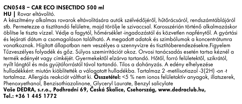 EKO rovarirtó INSECTIDO hatékonyan tisztítja a szélvédőket, a hűtőmaszkot, a rendszámtáblát és a tükröket. Védőréteget képez, megkönnyíti a további mosást és csökkenti a szennyeződések tapadását. Űrtartalom 500 ml.