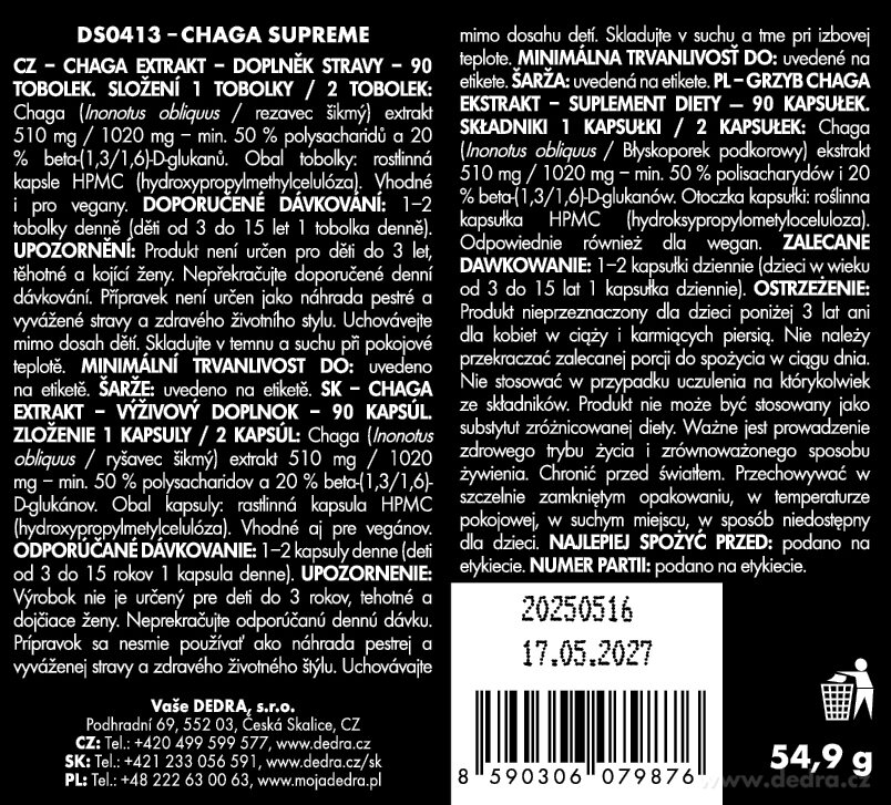 - 1x CHAGA SUPREME 510 mg, 50 % poliszacharid + 20 % béta-glükán, 90 kapszula