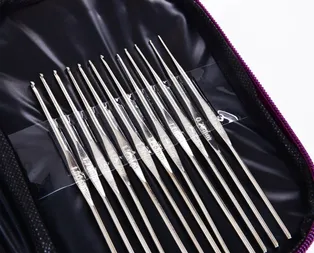 Az ezüst horgolótű hossza 12 cm, a színes horgolótű hossza 14,5 – 15 cm. A tok mérete 13 x 18 cm, vastagsága 2 cm.