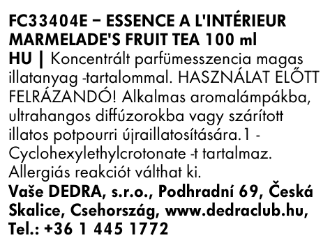 Parfüm esszencia nagy illatanyag-tartalommal. Nagyon jól oldódik vízben. Aromalámpákba, ultrahangos diffúzorokba vagy szárított illatos pot-pourri újbóli illatosítására alkalmas. Vonzerővel ellátott csomagolásban kapható, arany fóliával.