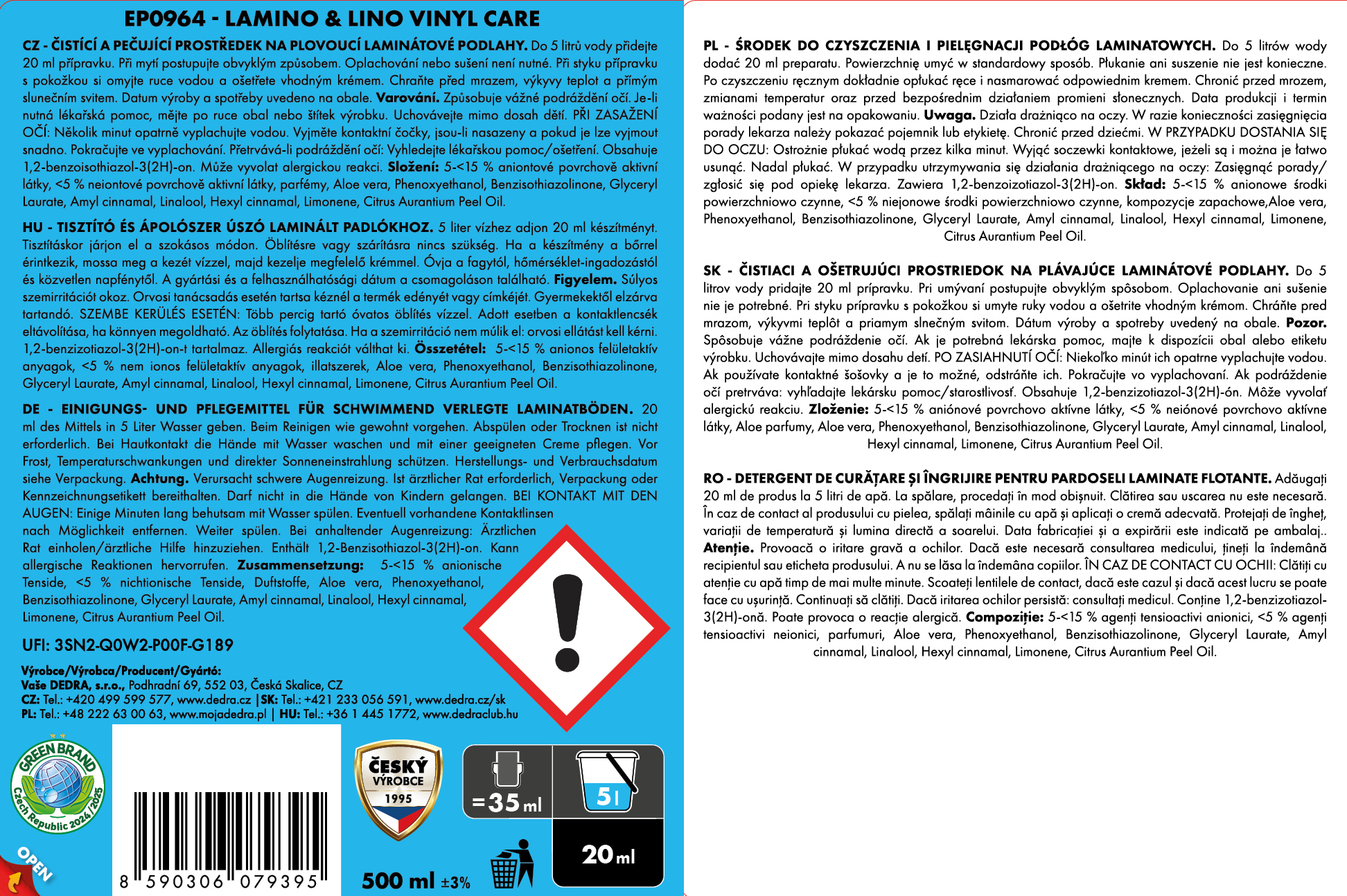 LAMINO & LINO VINYL CARE | Tisztító és ápolószer a laminált, lebegő padlókhoz, vinilhez és linóleumhoz | 500 ml | 25 mosás