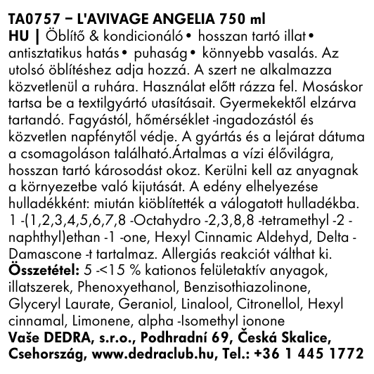 A L’AVIVAGE 2in1 lágyító kondicionáló KÉT ÖSSZETEVŐS antistatikus, puhító és illatosított szer, amelyet az utolsó öblítéshez adunk a mosógépben vagy kézi mosás során. 750 ml egyenlő 4,5 l hagyományos lágyítóval.