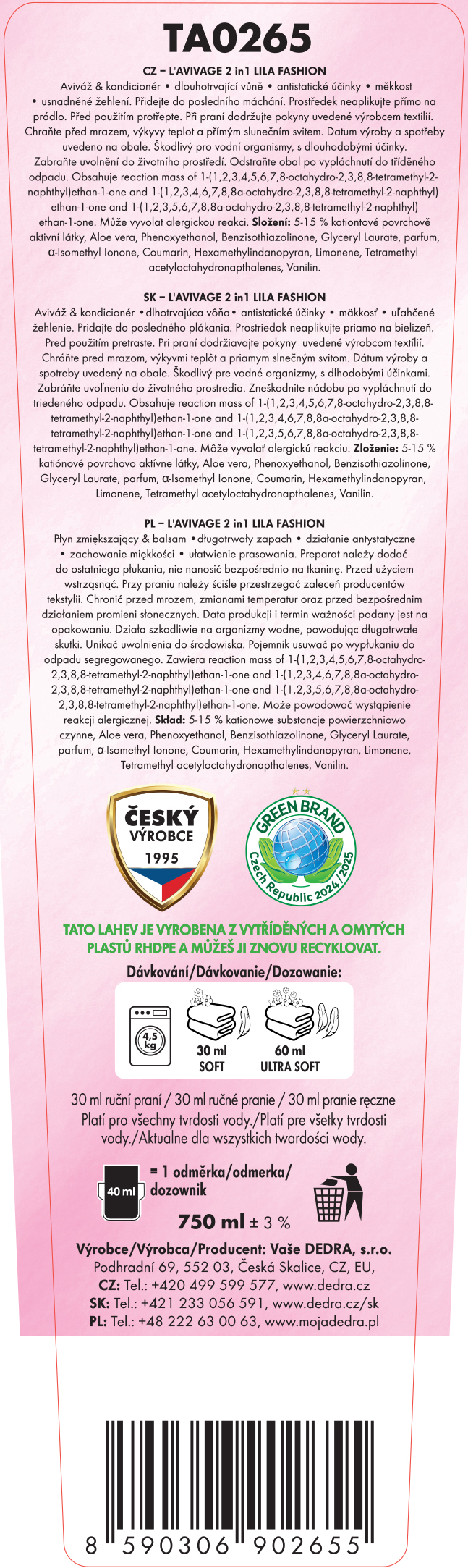 A L’AVIVAGE 2in1 lágyító kondicionáló egy KÉT RÉSZBŐL álló antistatikus, lágyító és parfümözött anyag, amelyet az utolsó öblítés során adnak a mosógéphez vagy kézi mosáskor. A 750 ml egyenértékű a 4,5 l szokásos lágyítóval.