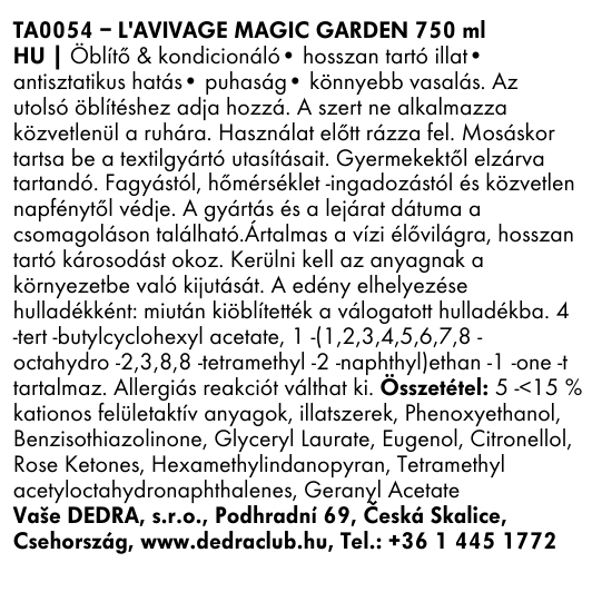 A textilszínező puhává teszi a ruhát, csökkenti a gyűrődést és megkönnyíti a vasalást. Eltávolítja az elektrosztatikus töltést és hosszan tartó illatot biztosít. Aloe verát és Elastil® ME-t tartalmaz a maximális puhaság érdekében. Kiemelkedő virágos-gyümölcsös MAGIC GARDEN parfüm illattal, amely luxus karaktert hordoz.