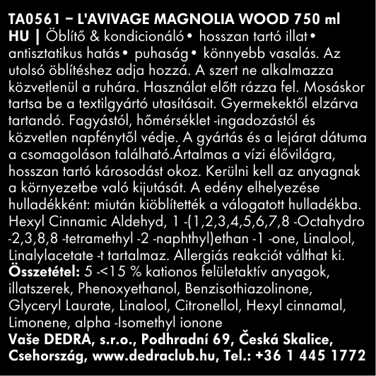 A lágyító puhává varázsolja a ruhát, megkönnyíti a vasalást és kiküszöböli az elektrosztatikus töltést. Az Aloe vera és az Elastil® ME biztosítja a puhaságot és a hosszantartó parfümözést. Virágos-poros MAGNOLIA WOOD illat, bergamot, rózsa, ylang-ylang, szantálfa és érzéki pézsma tónusokkal.