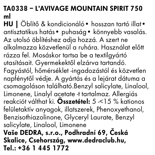 Az L’AVIVAGE 2in1 öblítő kondicionáló KÉTSZAKASZÚantistatikus, lágyító és parfümözött szer, amelyet a mosógép utolsó öblítéséhez vagy kézi mosásnál adunk hozzá. 750 ml megfelel 4,5 l szokásos öblítőnek.