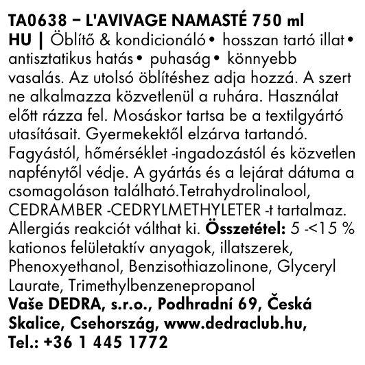 Az L’AVIVAGE 2in1 öblítő kondicionáló KÉT ÖSSZETEVŐS antistatikus, puháító és illatú szer, amelyet az utolsó öblítéshez adunk a mosógépben vagy kézi mosáskor. 750 ml megfelel 4,5 l szokványos öblítőnek.