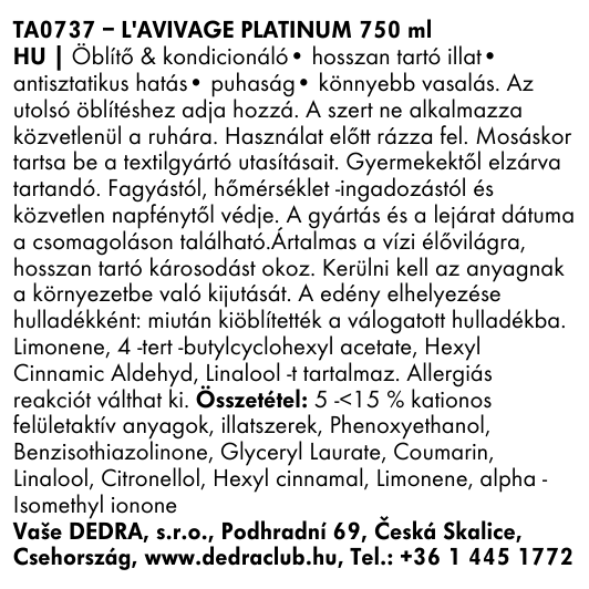 A L’AVIVAGE 2in1 balzsam DUAL antistatikus, lágyító és parfümözött készítmény, amelyet a mosógép utolsó öblítésekor vagy kézi mosás során adnak hozzá. 750 ml a szokásos balzsam 4,5 l-nek felel meg.