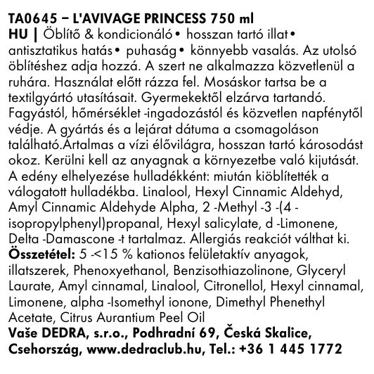 A puhaítő az anyagokat lágyítja, megkönnyíti a vasalást és csökkenti az elektrosztatikus töltést. Az Aloe vera és az Elastil® ME biztosítják a puhaságot és a tartós illatot. Friss gyümölcsös-virágos illatú PRINCESS, mandarinnal, jázminnal, ibolyával, őszibarackkal és szantálfával.