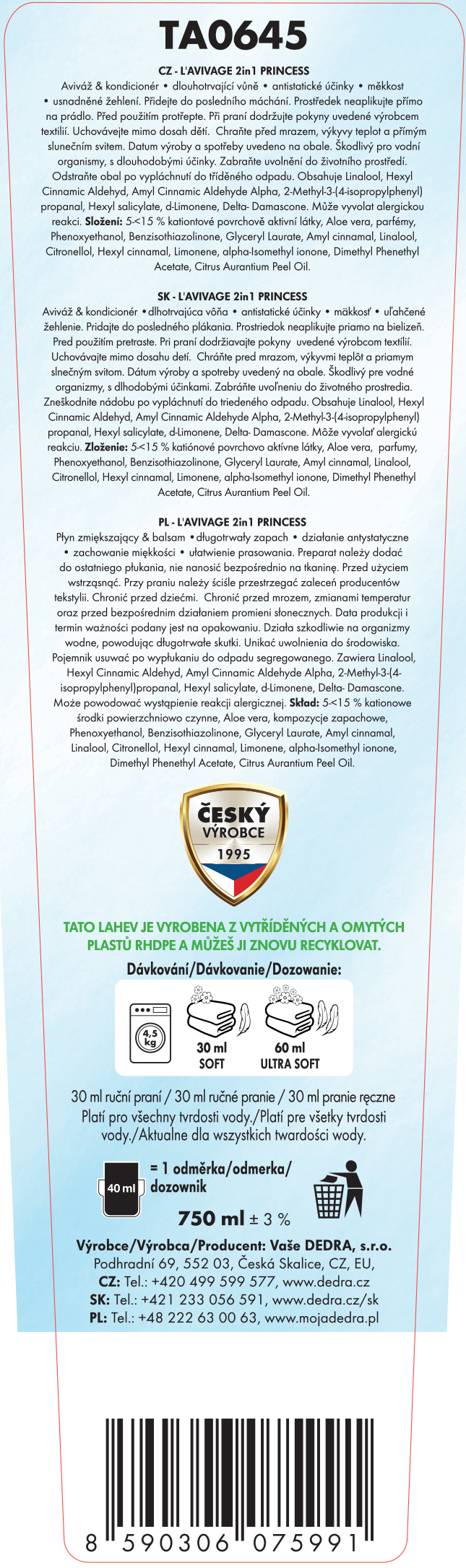 A L’AVIVAGE 2in1 puhaító kondicionáló KÉT ÖSSZETEVŐS antistatikus, puhaító és illatosított szer, amelyet a mosás utolsó öblítéséhez vagy kézi mosás során adnak hozzá. 750 ml megfelel 4,5 l szokásos puhaítónak.