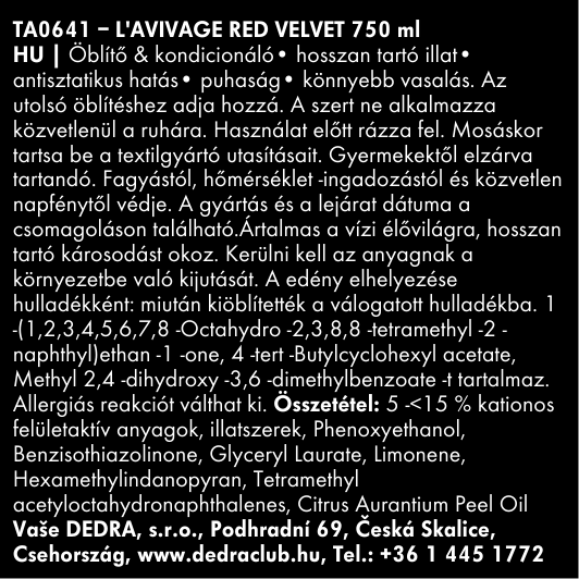 Az öblítő puhítja a ruhát, megkönnyíti a vasalást és megszünteti az elektrosztatikus töltést. Az Aloe vera és Elastil® ME-nek köszönhetően a ruha hosszan puha és illatozó marad mosás után. Luxus keleti RED VELVET parfümmel, amely sáfrány, jázmin, ambra, moha, pézsma és cédrus árnyalatokkal rendelkezik.