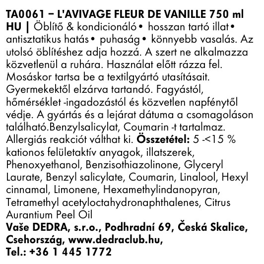 A L’AVIVAGE 2in1 öblítő kondicionáló egy KÉT ÖSSZETEVŐBŐL ÁLLÓ antistatikus, lágyító és parfümözött szer, amelyet a mosógép utolsó öblítéséhez, vagy kézi mosás során adunk hozzá. A 750 ml megfelel 4,5 l hagyományos öblítőnek.