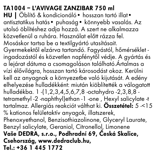 A textilöblítő L’AVIVAGE 2in1 egy KÉTSZÍNŰ antistatikus, puhító és illatosított szer, amelyet az utolsó öblítéshez adnak a mosógépben vagy kézi mosás során. 750 ml megfelel 4,5 l hagyományos textilöblítőnek.